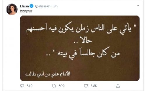 نشرت الفنانه إليسا علي حسابها الشخصي”تويتر” صوره تتضمن مقولة للإمام على ابن أبي طالب ” يأتي على الناس زمان يكون فيه أحسنهم حالا من كان جالسا في بيته”؛ لحث المواطنين على الجلوس في المنازل ومواجهة الفيروس.